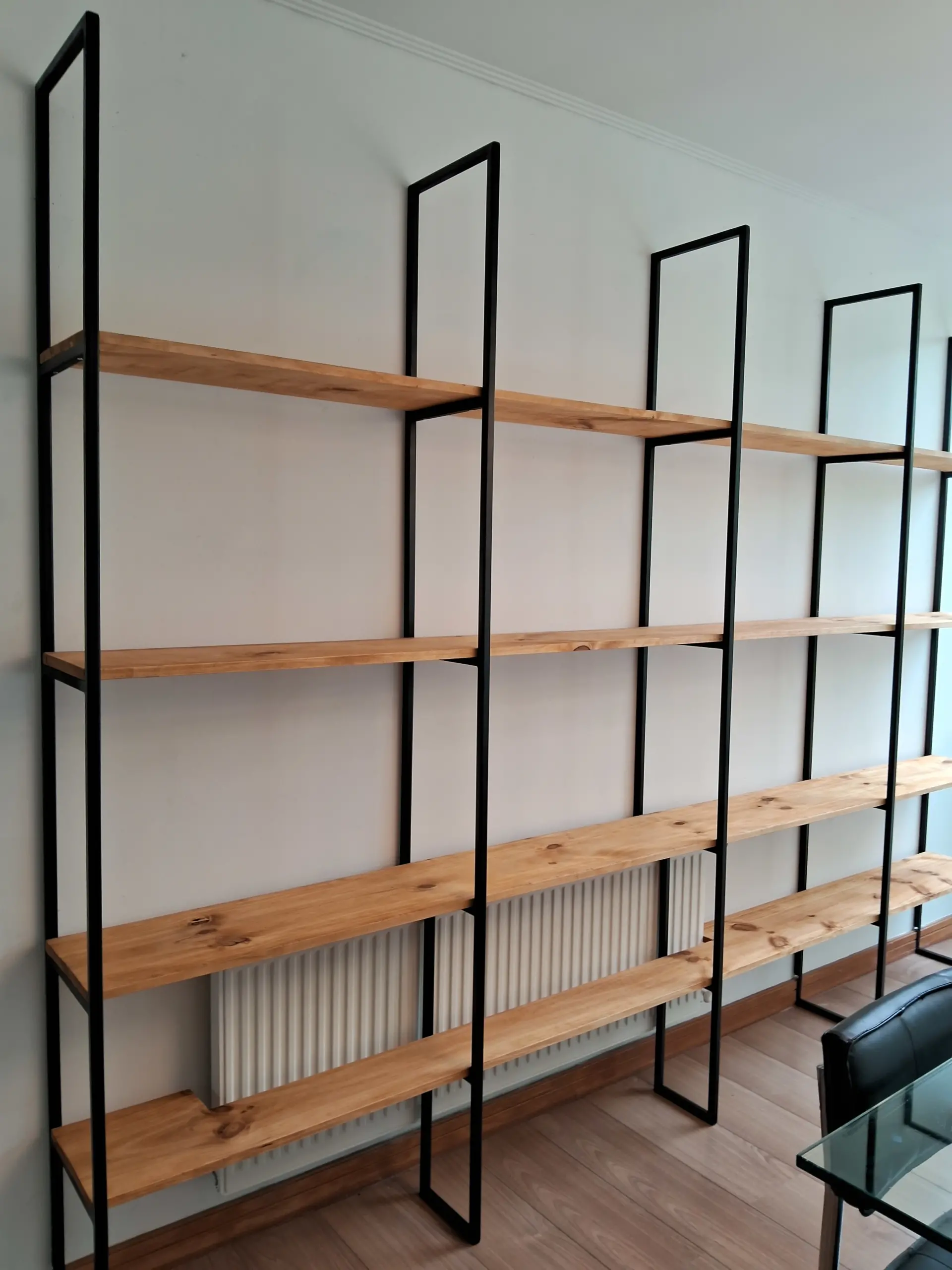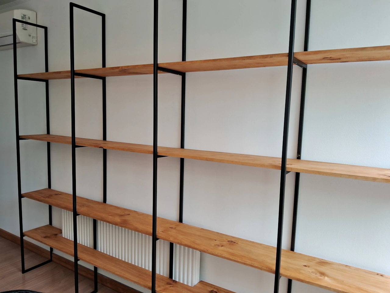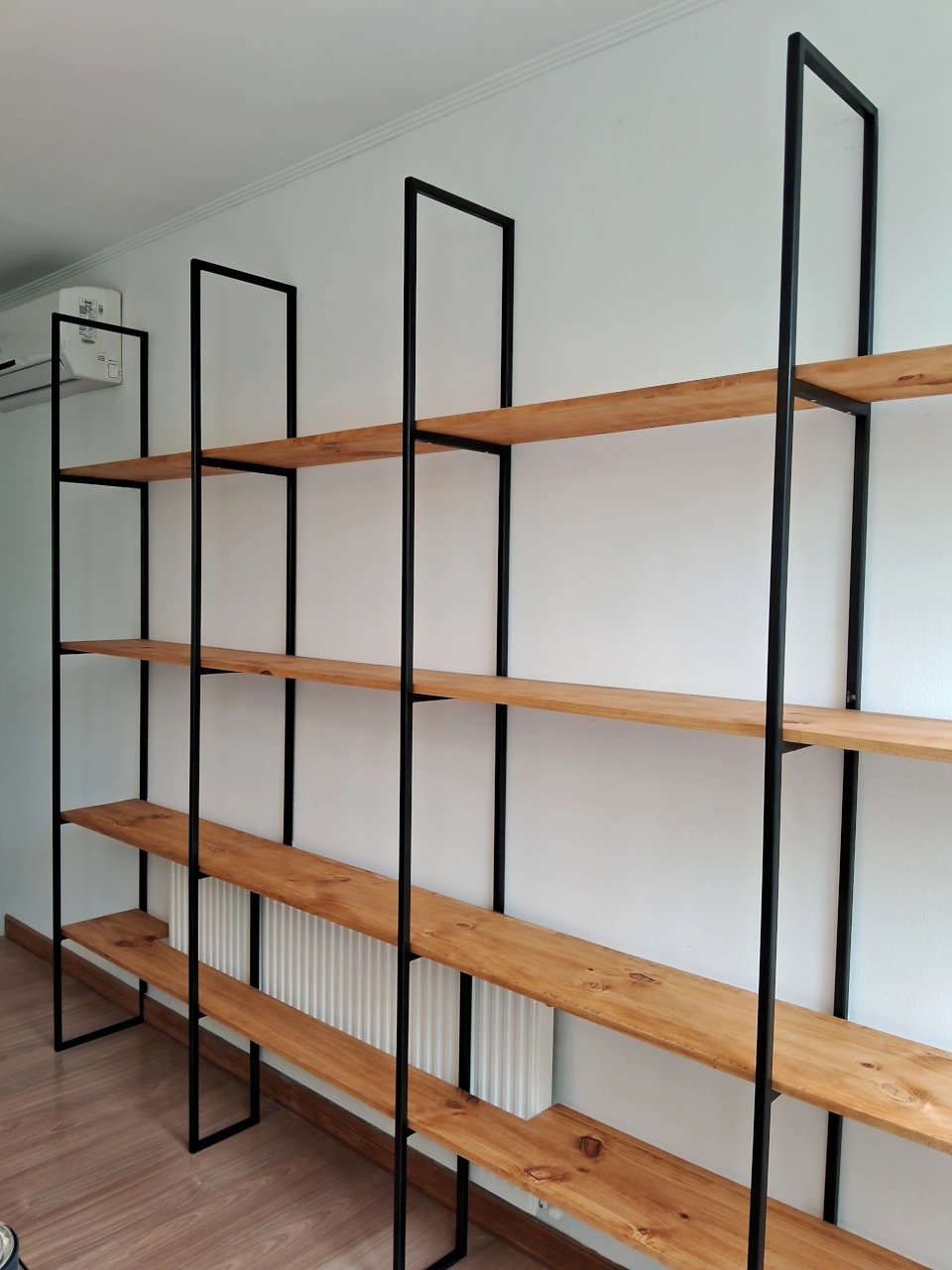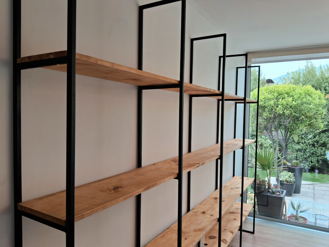 Terminación de la estructura metálica en color negro mate, pintada con compresor. Repisas en madera seca, cepilladas, pulidas y con acabado con protector e impermeabilizante en tono a elección de cliente.