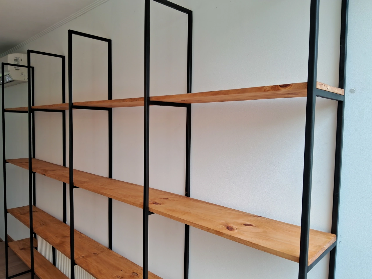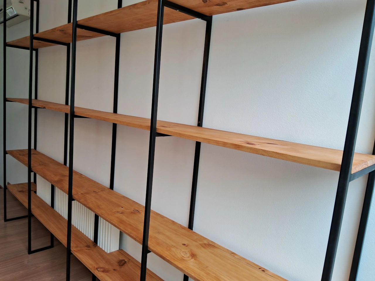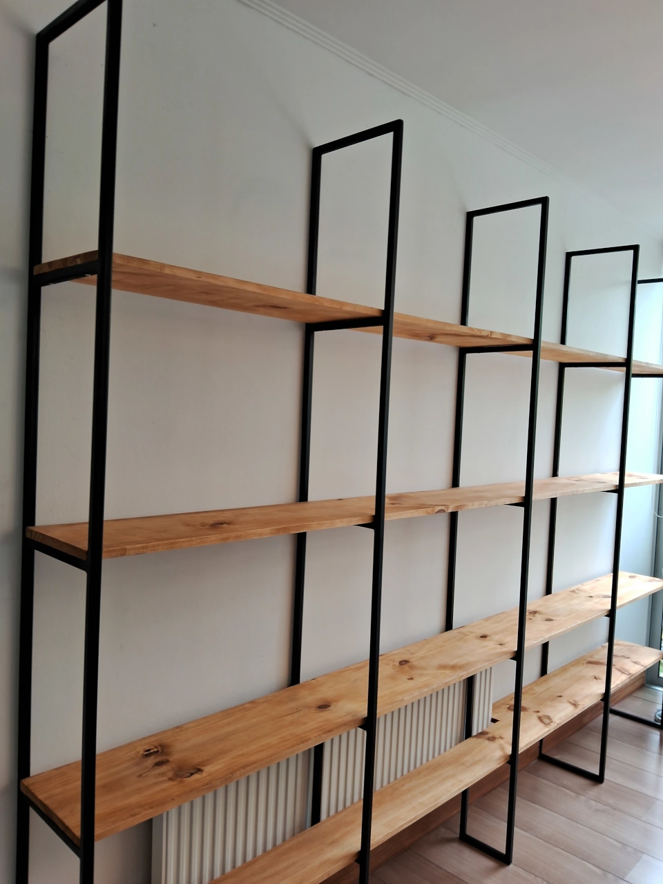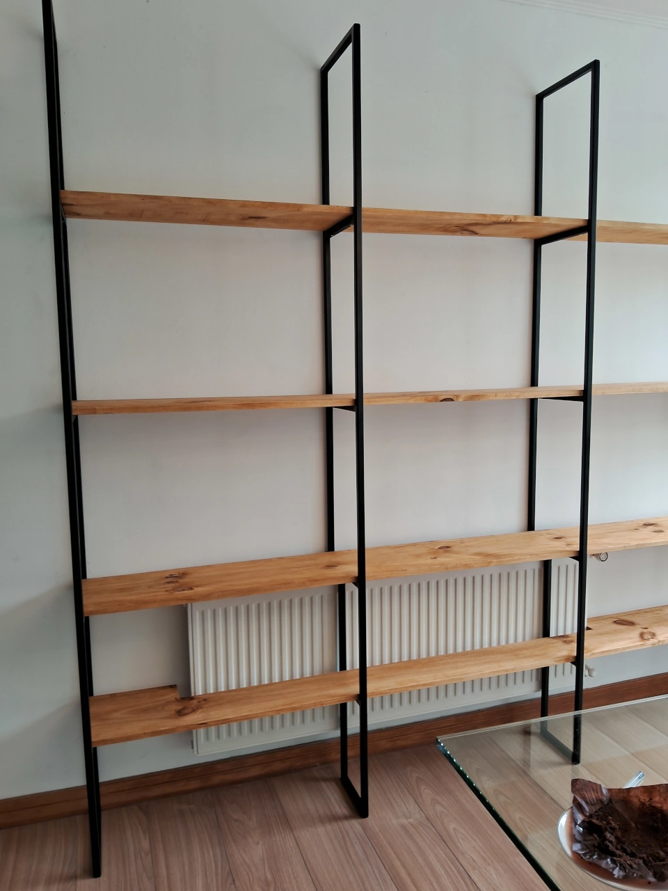Terminación de la estructura metálica en color negro mate, pintada con compresor. Repisas en madera seca, cepilladas, pulidas y con acabado con protector e impermeabilizante en tono a elección de cliente.