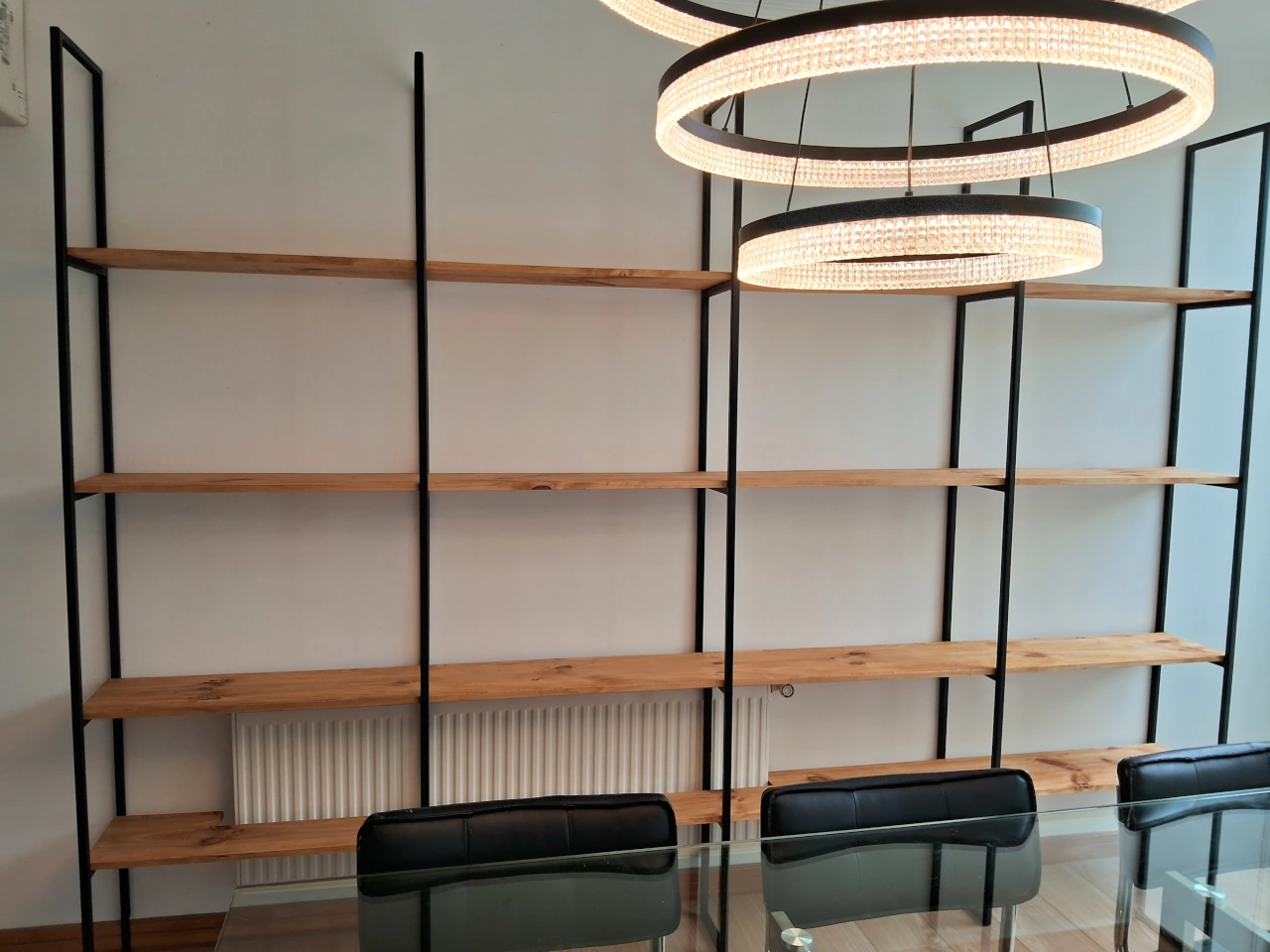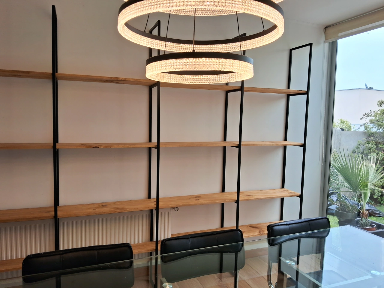 Estante de fierro y madera, es un mueble que combina la resistencia y la elegancia de estos dos materiales, aportando un toque de estilo industrial. Diseñado a medida para complementar de forma decorativa el muro principal del comedor. Cuenta con 4 niveles de repisas a diferentes alturas.